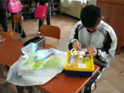 エプロン作りをしています。アイロンでかたを付けてそこを仮縫いします。その後,おそるおそるミシンをかけました。ミシンって速い!と感動しています。