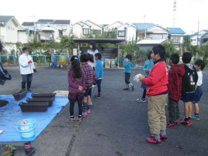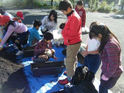 花育の活動をしました。プランターに石を入れ,土を入れました。そこにパンジーを植えました。パンジーの周りに,優しくそっと土を入れることができるように注意深く行いました。