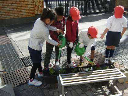 プランターは校門前まで運びました。そして,たっぷりの水遣りをしました。みんなで大切にしていきたいです。