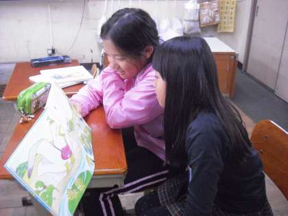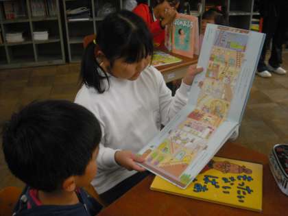 1年生は,楽しい絵が多い絵本がお気に入りでした。「どこに隠れてるかな?」などと語りかけると一生懸命さがしてくれます。それを見ている6年生も楽しそうでした。