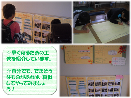 4・5・6年生や先生達がやっている「早く寝るための工夫」も紹介していますので,できることは真似してみるといいですよ。