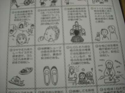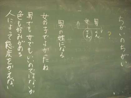 男女のいろんな生活の中の区別や差別について,16枚のカードを見ながら考えました。「結婚すると女性は姓がかわる人が多く男性は少ない。」のカードでは,「そんなのはどちらでも話し合って決めればいい。」といった発言が多かったです。だんだんそうなっていくのかもしれません。