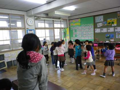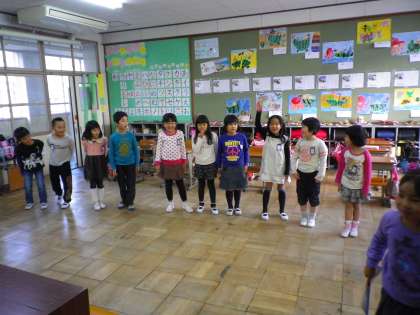 1年生が昼休みに5年生の「キツネはだれだ」をしてくれました。1回しか観てないのに,せりふも覚えていて感心しました。かわいい1年生,ありがとう。
