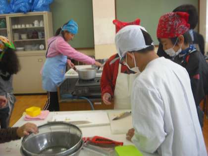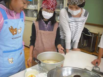 5年生と「スイートポテト」を作りました。みんなで協力してせっせとサツマイモの皮むきをし,大きさもなんとかそろえて切ってくれました。上手にゆでられ,砂糖や牛乳バターと溶き卵をザァーといれ,みんなで仲良く混ぜていました。