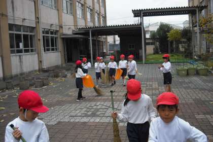 くまでとほうきとちりとりを持って,いざ学校の周りの落ち葉拾いに出発です。