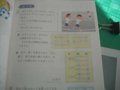 「場合を順序よく整理して」を勉強しています。3人の走る順番が何通りできるか全部書き出して生きます。順序良く整理して考える練習です。