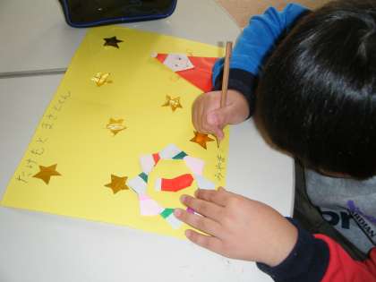 2組では,今週の金曜日の1時間目に呉竹総合支援学校の友達と交流学習をします。交流学習の後で友達に渡すカードを作りました。サンタクロースとリースとくつしたを折り紙で折って貼りました。当日が楽しみです。