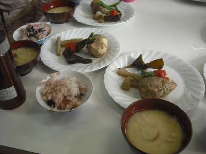 黒豆ごはんもほっくり炊けて,梅ぼしを混ぜ合わせた味がおいしかったです。えび芋もにんじんもとろりと軟らかくあじがしみていて驚きました。白味噌は煮込んでもいいことや,豚肉は最後にさっといれるコツも教わりました。