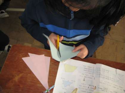 算数の時間には,三角形や四角形には,どのような性質があるのか,勉強しています。今日は,四角形を直線で2つに切り,「三角形を2つ作る」「三角形1つと四角形1つを作る」「四角形を2つ作る」学習を行いました。どんな形ができるのか,見通しをもちながら,はさみで四角形を切る子どもたちの姿が見られました。