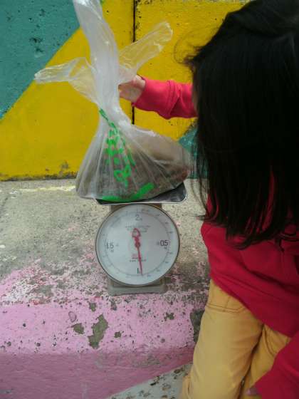 算数で,「重さ」について学習しています。今日はスーパーの袋に砂を入れて,1kgを作る学習をしました。「牛乳パック1本分の重さ」と言いながら砂を入れていたのですが,測ってみると960gというニアピンの子もいましたが,2kg近い子や500g程度の子も。。。