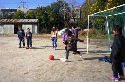 遊び係の全員遊びはキックベースでした。今日は、風が冷たくて寒かったですが、やはり外の空気を吸うと気持ちがいいですね。