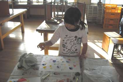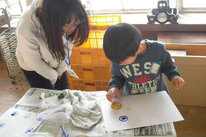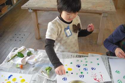 れんこんやだいこんのへた,やさいを使って,画用紙にぺったんしました。