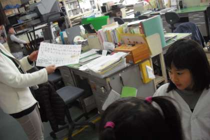 職員室に「どんぐりフェスティバル」の招待状を届けに行きました。