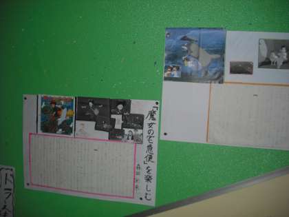 6年生の掲示物を貼る場所に「鳥獣戯画を読む」の高畑さんの文章を真似て,一人ひとりがお気に入りの作品を紹介する文を書いたものを貼りました。懇談会の時にでも是非読んでみて下さい。なかなか工夫がされていて面白いです。