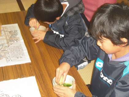 おいしい和菓子のいただくときも両手をそろえて挨拶をします。左右の人にも「お先です。」と心を配ります。慣れないながらもきちんと挨拶をしたステキな時間でした。お茶も一生懸命にたてました。凛としたふんいきでした。