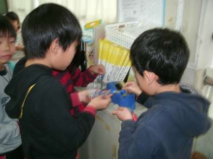 理科で電気の学習をしています。乾電池と豆電球を使ったテスターを作り,教室にある色々なものが電気を通すかどうかを確かめました。ハサミやファスナーの金具,ドアの取っ手など金属のものは電気を通し,プラスチックや木などは電気を通さないことを確かめることができました。ロッカーなどの金属でできているものでも,ペンキなどが塗ってあると電気を通さないことも分かりました。