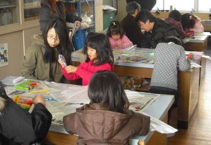 家の方に手伝ってもらいながら,思い思いのイラストをカイトに油性マジックで描きました。運動場に出ると,はじめのうちは風が弱く,走り回りながらカイトをあげていましたが,後半には程よい風が吹き始め,空高くカイトが昇っていくようすに歓声が上がっていました。