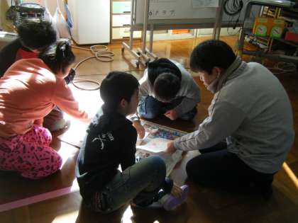 各校から歌や詩の朗読等の交流をしてから,看板作りもしました。折り紙をちぎって貼りました。共同作品は食べ物をテーマに各校の作品を合体させます。