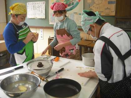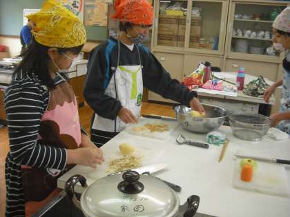 家庭科の本にあるジャーマンポテトを作りました。メークインのおいしそうなジャガイモをむいています。にんじんやたまねぎも手早く洗って準備をしていました。