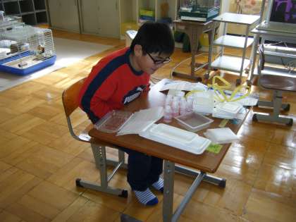 空き容器を見て,きれいに洗って乾かすと図工に使えそうだねと話しました。納豆の箱を並べて繋げて,巨大板チョコを作ることにしました。