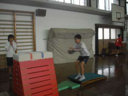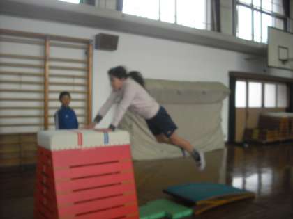 跳び箱を5年生としています。5年生が上手に跳ぶと,6年生もちょと意地をみせて粘り強く頑張ります。準備も後片付けも協力してみんながさっと動いています。今は台上前転を練習しています。