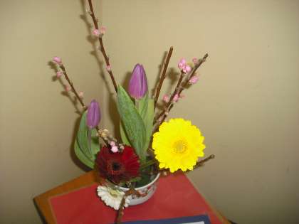 先日華道教室で生けましたお花がとてもかわいく廊下を明るくしています。寒い日が続くのであまり痛まず,長くお花が楽しめそうです。