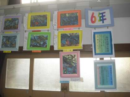 やっと作品ができました。色画用紙に貼り付けて体育館に飾りに行きました。9人の版画の作品のテーマは「やまなし」。水の中の様子から苦労して表現していた色の流れを見ていただけたらと思います。