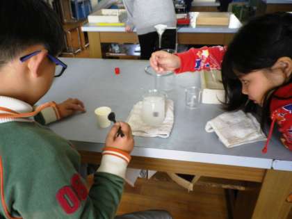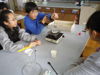 ミョウバンの結晶を取り出す学習です。温めたりろ過をしたりする作業にも慣れてきたようです。