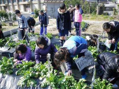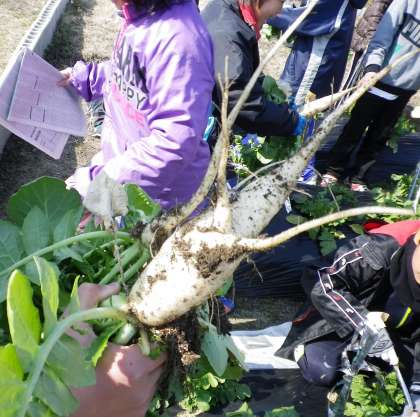 今日はふれあい農園に行きました。1番育っている大根を抜いてみると,立派な大根になっていました。おうちでおいしく食べてください。また,来週も収穫しましょう。