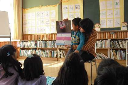 「へんしんするゆび」「しゃっくり1かい1びょうかん」「ひともじえほん」の3冊の読み聞かせをしていただきました。