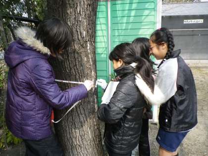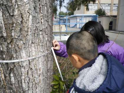 円周と直径について学習しています。今日は,木の周りの長さを測り,そこから直径の長さを求めました。