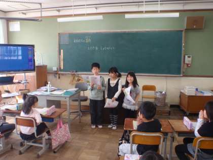 新しく配布された「道徳」の本を使って,「あなたのことを教えてね」をしました。自分の好きなことや将来の夢など,たくさん書いて自己紹介のようにして知ってもらいました。1年間、同じ教室で勉強してきたのですが,知らないこともたくさんあったようで,友達のことで新しい発見ができました。