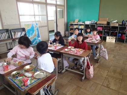 新学期最初の給食をいただきました。久しぶりの給食に大喜びしました。新学年になって身長も伸び、たくさん食べるようになりました。