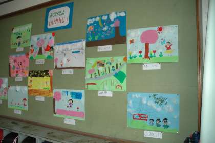 教室の掲示板が,図画工作の作品と,2年生の目標を書いた顔写真入りの画用紙で飾られました。教室がどんどん明るく楽しくなってきました。