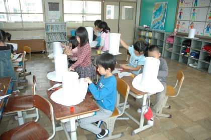 画用紙で帽子を作りました。今はまだ白い帽子ですが,次の図画工作の時間に素敵に飾ります。どんな帽子に仕上がるか楽しみです。