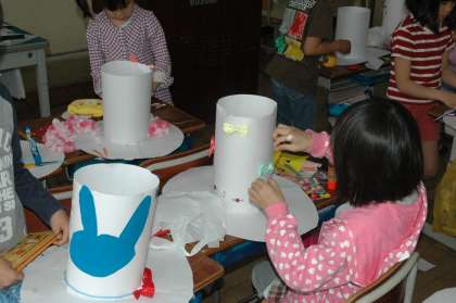 図画工作で取り組んでいる帽子作りの続きの作業をしました。思い思いの材料を帽子につけていきます。そしてオリジナル帽子の完成です。次の参観日に展示します。ぜひ,見に来てください。