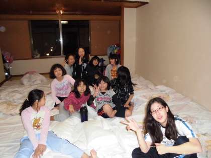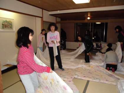 みんなで協力することも学びました。一人ひとりでシーツをかけるのはたいへんですが二人でやればはやくてきれいにできます。手の空いているひとは布団を整えさーっと準備ができました。