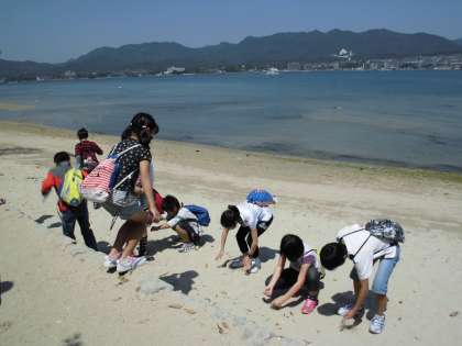 シカたち,もきれいな砂浜,良い天気に恵まれたっぷり宮島の自然のなかで楽しめました。睡眠不足を感じさせないぐらいしっかり活動していて,これは18人のすばらしいエネルギーだと思いました。