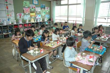 今日は一日,学生ボランティアの先生といっしょに学習しました。国語や算数はもちろん,給食もいっしょに食べました。いろいろな話がたくさんできて楽しい一日になりました。