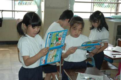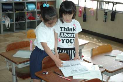 1年生で習った漢字を使って文章を作りました。挿絵の話に合うように漢字を選び作ります。うまく文章を作ることができたので,友達と見せ合いをしました。