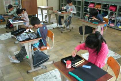 初めての毛筆での書写の学習に取り組みました。道具の名前や使い方を学んだあと,筆を持って縦棒や横棒,渦巻きなどをためし書きしてみました。