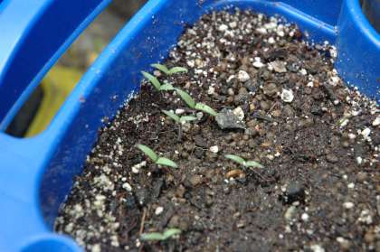 ミニトマトの種を植えて,一週間で発芽しました。10粒ほど植えたのでたくさん芽が出てきました。これからも心を込めて世話をします。