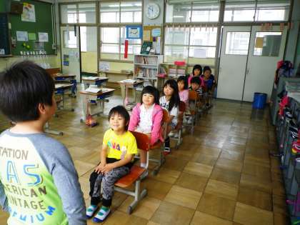 「なんばんめ」の学習をしています。一列に並び「まえから○人」や「うしろから○人目」という言葉に合わせて立ち,理解を深めました。