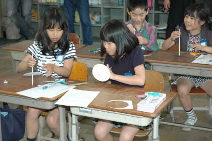 土曜参観の2校時は,図画工作をしました。内容は,トリックアートといわれるものです。見ているだけで渦を巻く絵を見て,簡単な動く模様を作りました。次に,ベンハムのコマ,といわれる白黒から色が見えてくるおもちゃを作りました。赤や青など様々な色を浮かび上がらせることができました。