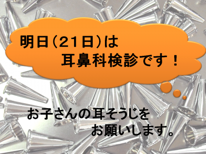 明日(21日)は,耳鼻科検診です。耳・鼻・のどを診ていただきます。