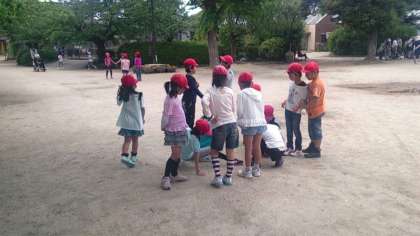 お弁当を食べた後,動物園の広場で遊んでいます。