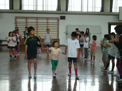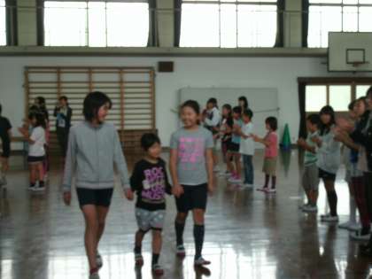 「1年生を迎える会」の最後は,6年生と一緒に教室まで手をつないで帰ります。大きな6年生に両手をひかれてとってもかわいい組み合わせでした。最初の大切な取組でした。