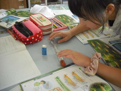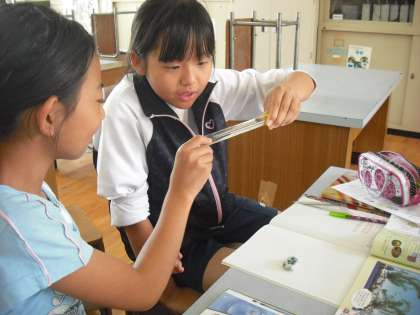 水槽からすくい取ったメダカを観察しています。