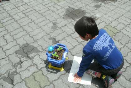 ホウセンカの本葉が育ってきました。初めに出た子葉(ふたば)との違いに気をつけて観察をしました。記録の取り方もだんだんと上手になって,イラストや気が付いたことを手早くノートに書き込んでいました。