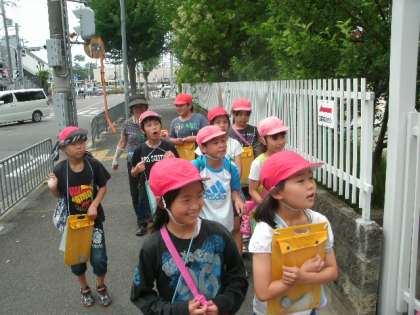 向島地域のたんけん3回目に行ってきました。今回は向島駅から一街区,向島二の丸小学校,向島中学校,あじさい苑の横を通り,近商ストアーなどのあたりを見学して3街区の中を通って帰ってきました。